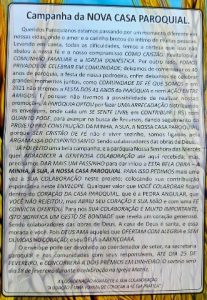 Neste ano de 2021 não será possível a realização da festa dos 41 anos de paróquia e nem ação entre amigos. Com o objetivo de dar seqüência no projeto de construção da “MINHA, A SUA, A NOSSA CASA PAROQUIAL”, a paróquia optou por fazer uma nova arrecadação por meio dos envelopes onde cada um se SENTE LIVRE em contribuir com o quanto pode. A sua colaboração é muito importante pois significa um gesto maravilhoso de BONDADE o qual revela desta forma o quanto seu CORAÇÃO É GENEROSO.
