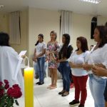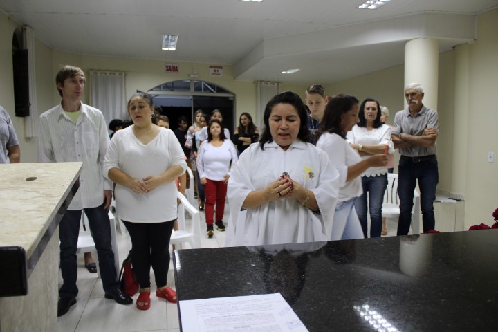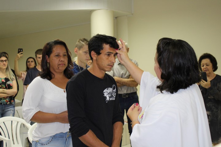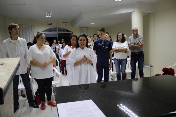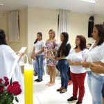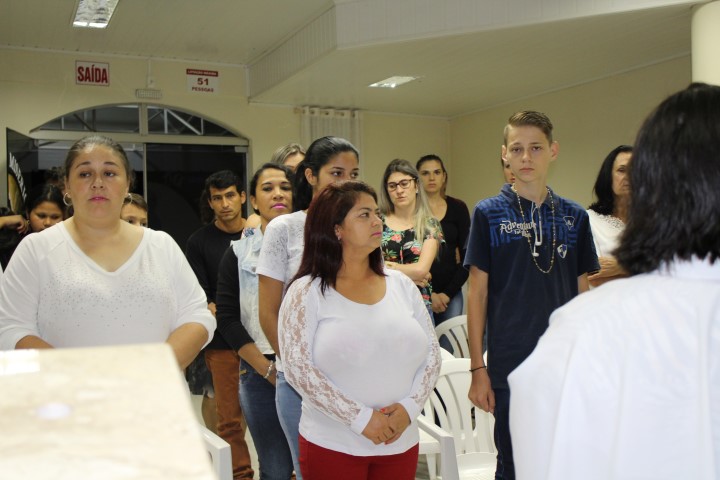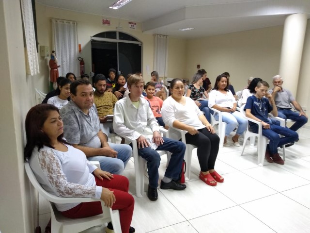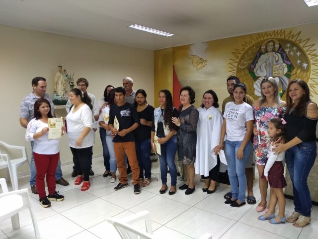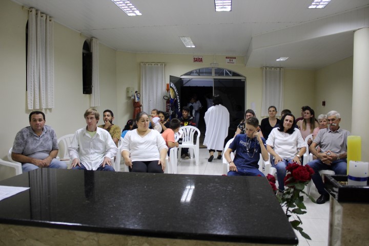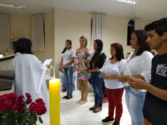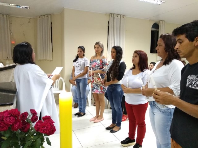 Aconteceu no dia 23 de abril na Capela da Misericórdia da comunidade da matriz a celebração do Sacramento do Batismo adulto. Depois de um bom tempo de preparação nesta noite realizou mais uma etapa da família desses adultos. A Atácia que acompanhou disse: “Hoje nossa paróquia e comunidade da matriz está em festa – com a alegria do ressuscitado. Há 5 meses estamos preparando 12 adultos entre 18 e 46 anos de idade, entre os quais 6 hoje celebram seu Batismo. Foi um momento único de graça e alegria aos olhos de todos. Uma emoção muito grande tomou conta de todos. Como catequista não consigo descrever o momento de comoção. Ainda temos para essa semana o retiro de quinta-feira, a confissão na sexta-feira e sábado dia 27 na missa da comunidade a primeira eucaristia de 8 deles e o Sacramento da Crisma da turma toda, ou seja, de 12 preparados. Essa é a segunda turma em menos de um ano já soma um total de 22 pessoas que receberam o sacramento. O que mais impressiona é a mudança visível deles. O que não tem preço. São assíduos e não faltam. Obrigado meu Senhor”! e conclui ela.