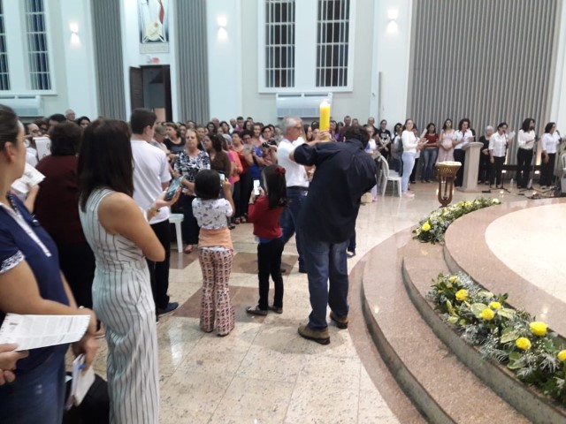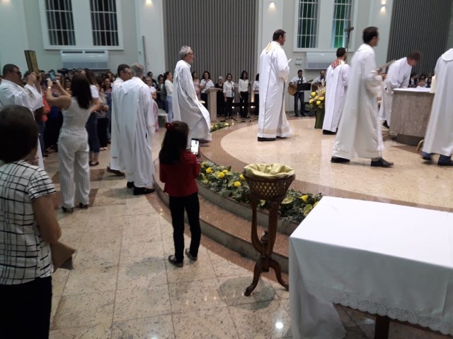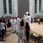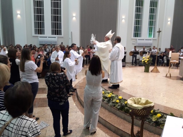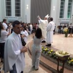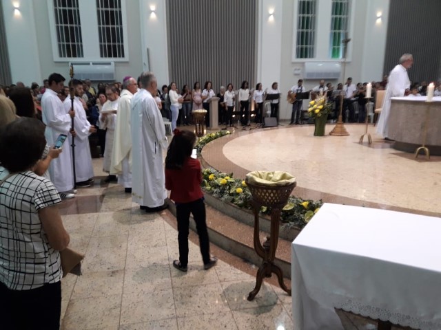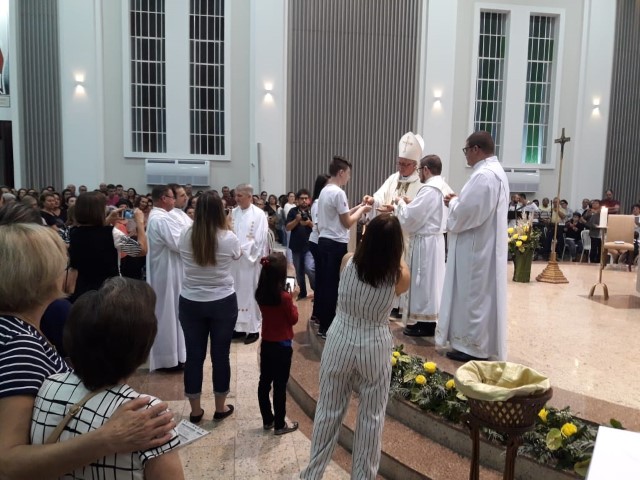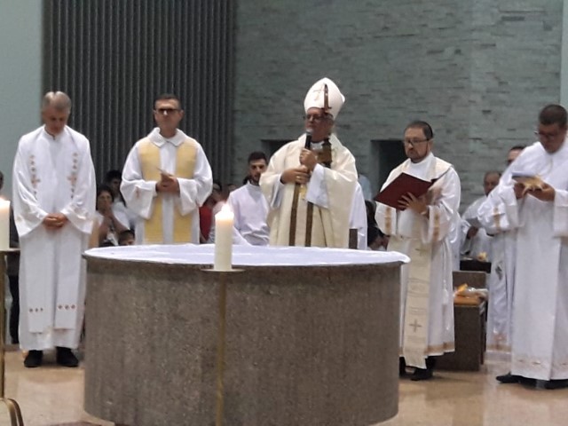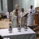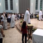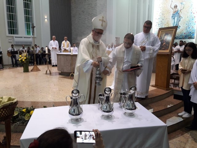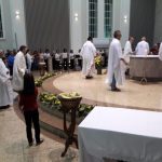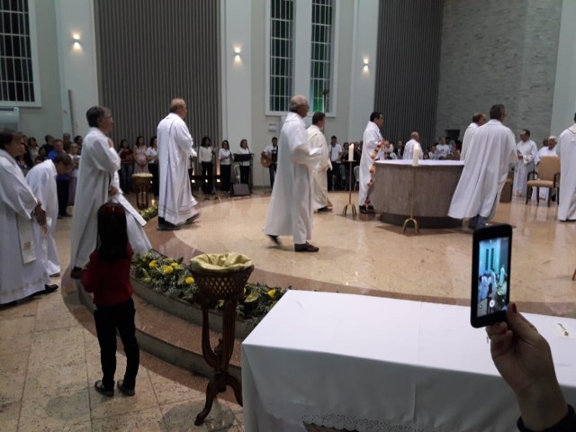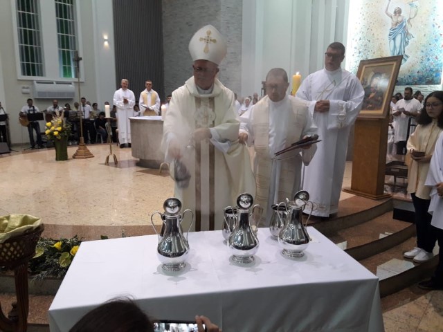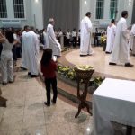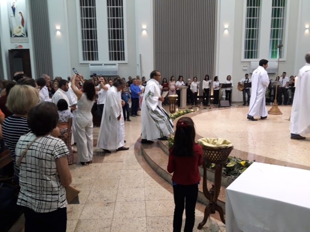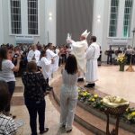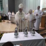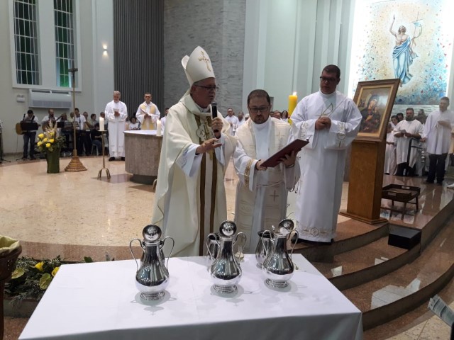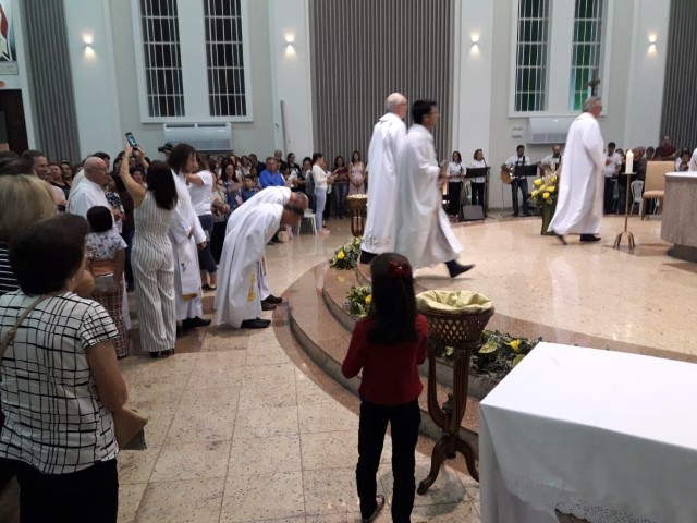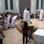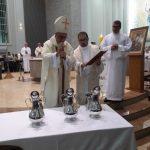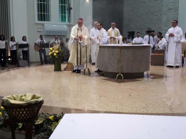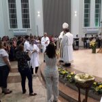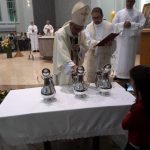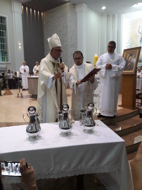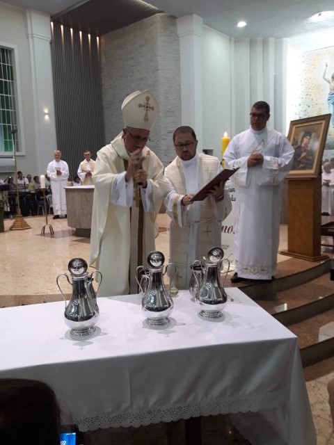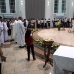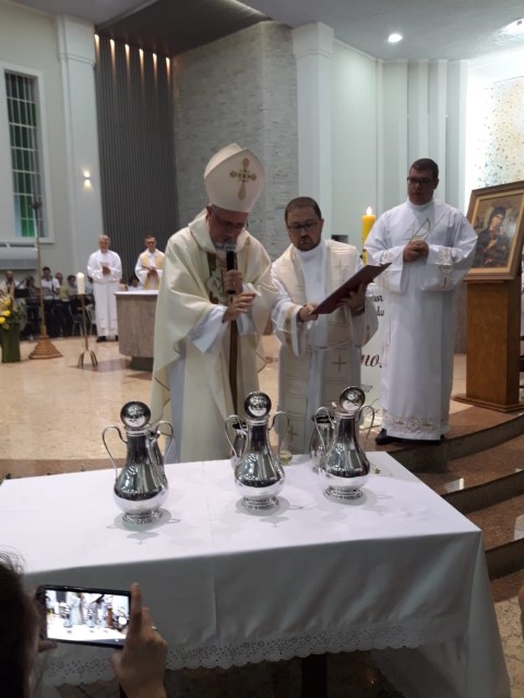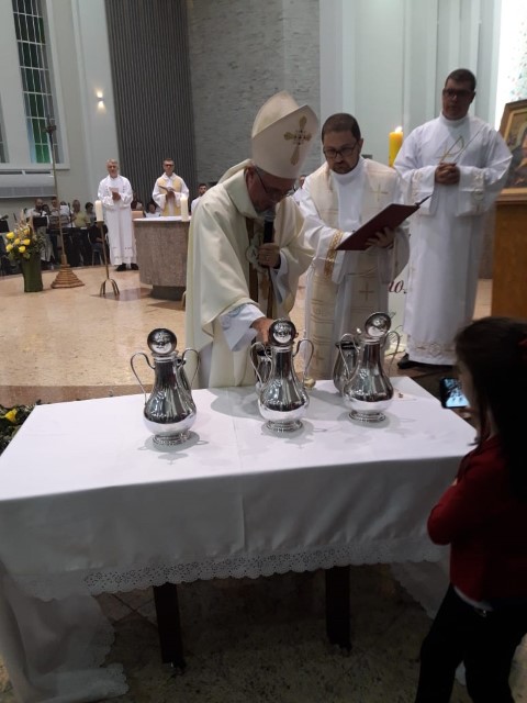 Aconteceu no dia 17 de abril na paróquia de Xanxerê a celebração dos Santos Óleos e da unidade da Santa Igreja. É chamada de “Missa do Crisma” ou “Missa Crismal” onde se abençoam os óleos dos catecúmenos e dos enfermos e a consagração do Santo Crisma. Também acontece a renovação das promessas sacerdotais pronunciadas no dia da ordenação de cada presbítero, por isso se diz que é a “Missa da Unidade”. De nossa paróquia fomos em três pessoas para participar desse momento importante de nossa igreja. Esteve na celebração a Mariane, a Leonita e o Olavio que disse: “Senti um forte sentimento de fé e devoção do povo presente. A celebração bem elaborada e conduzida pela equipe de liturgia e canto com momentos fortes de reflexão ao verdadeiro sentido do cristão.