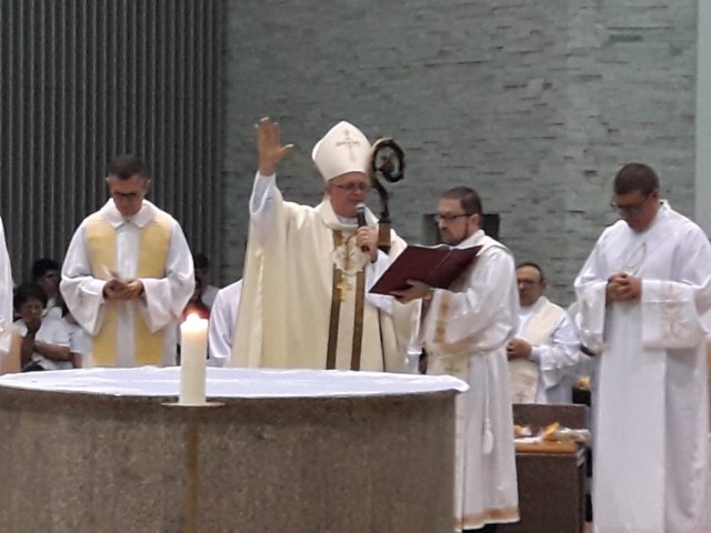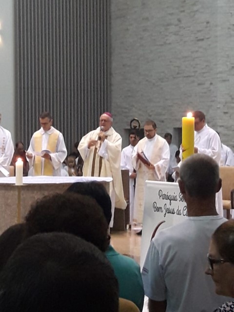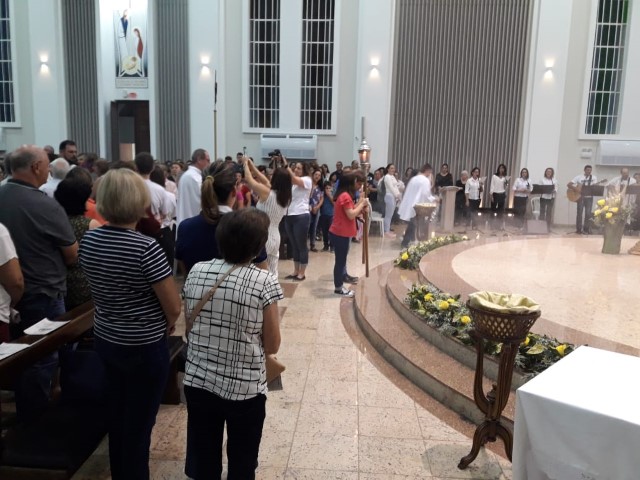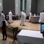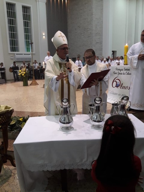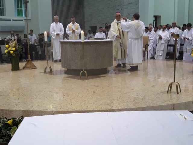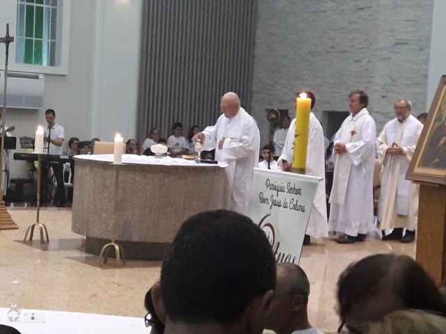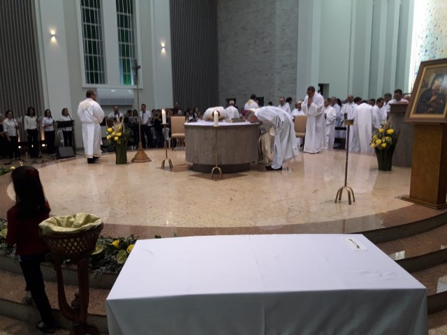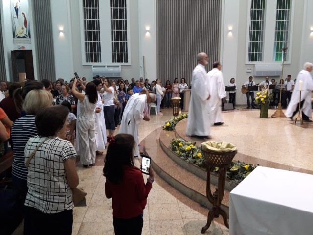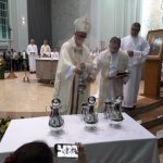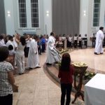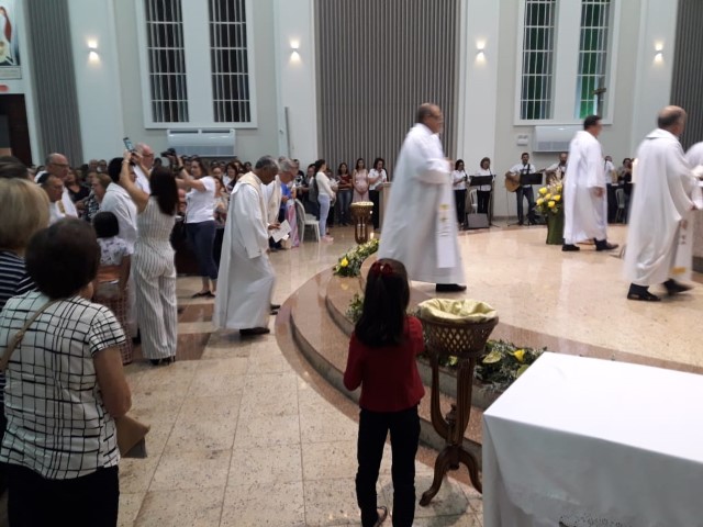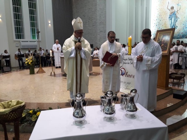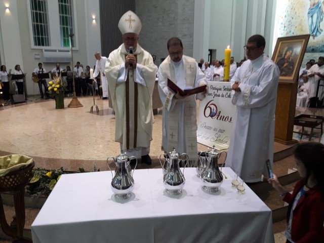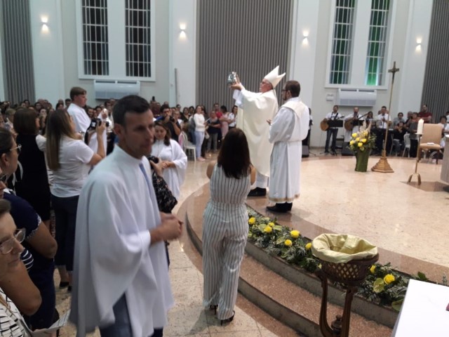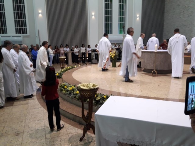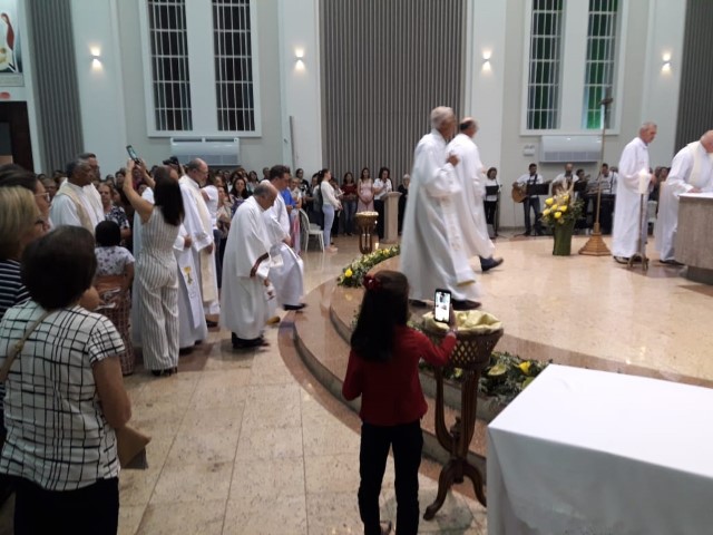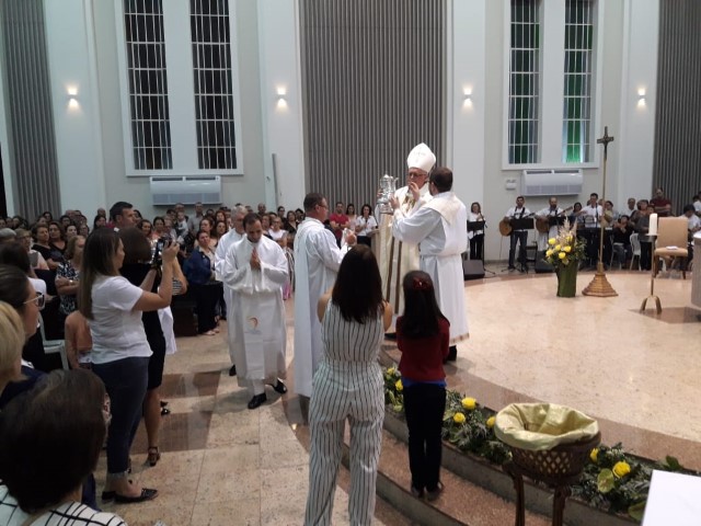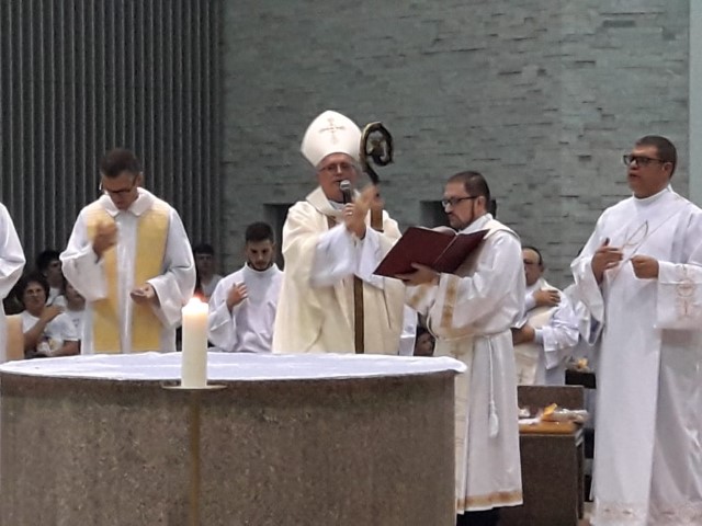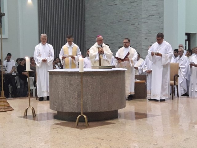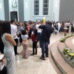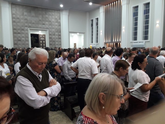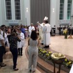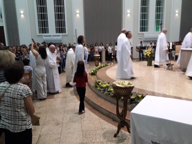 Aconteceu no dia 17 de abril na paróquia de Xanxerê a celebração dos Santos Óleos e da unidade da Santa Igreja. É chamada de “Missa do Crisma” ou “Missa Crismal” onde se abençoam os óleos dos catecúmenos e dos enfermos e a consagração do Santo Crisma. Também acontece a renovação das promessas sacerdotais pronunciadas no dia da ordenação de cada presbítero, por isso se diz que é a “Missa da Unidade”. De nossa paróquia fomos em três pessoas para participar desse momento importante de nossa igreja. Esteve na celebração a Mariane, a Leonita e o Olavio que disse: “Senti um forte sentimento de fé e devoção do povo presente. A celebração bem elaborada e conduzida pela equipe de liturgia e canto com momentos fortes de reflexão ao verdadeiro sentido do cristão.