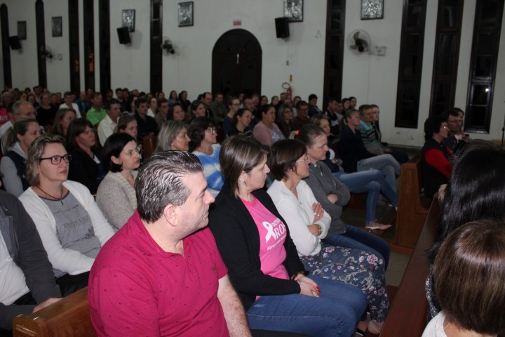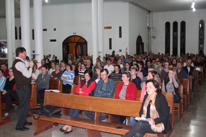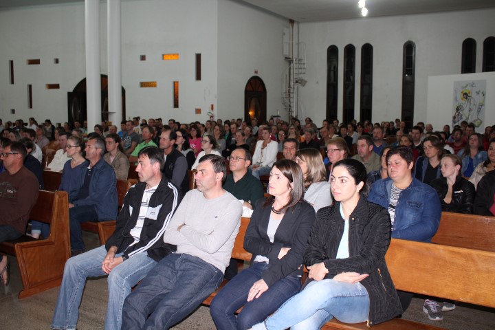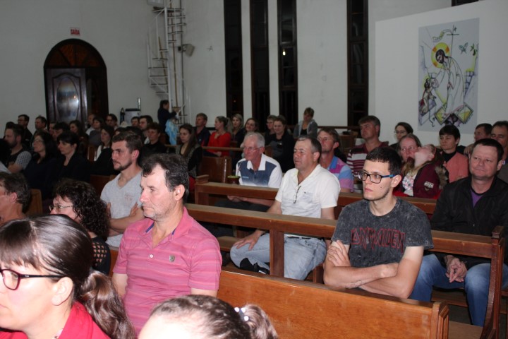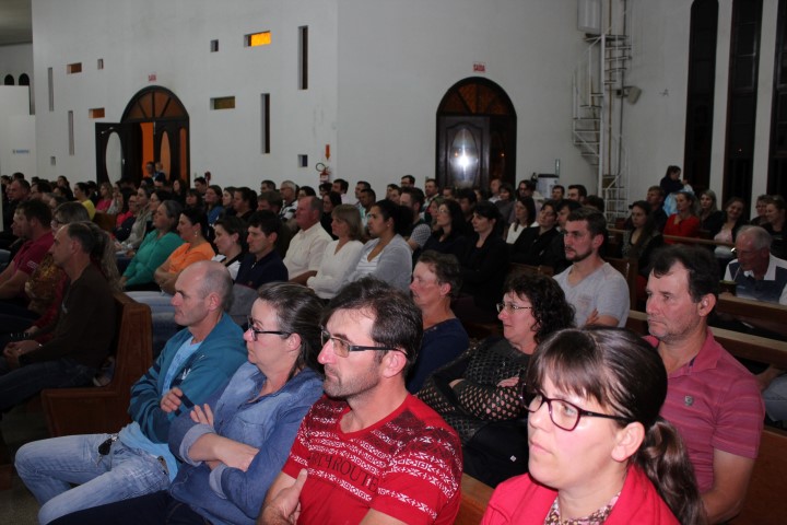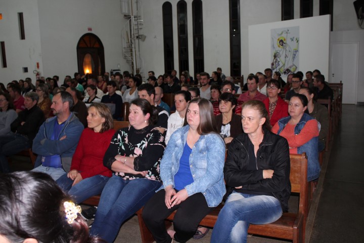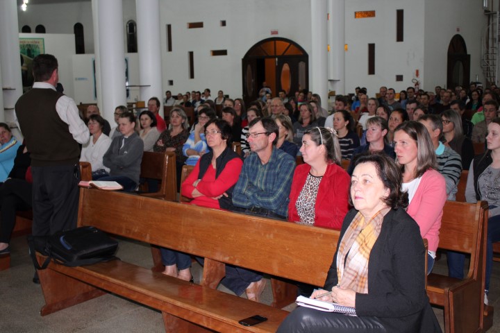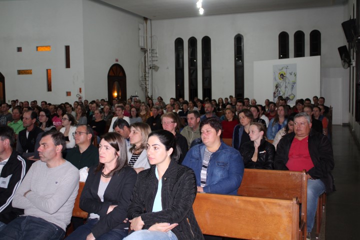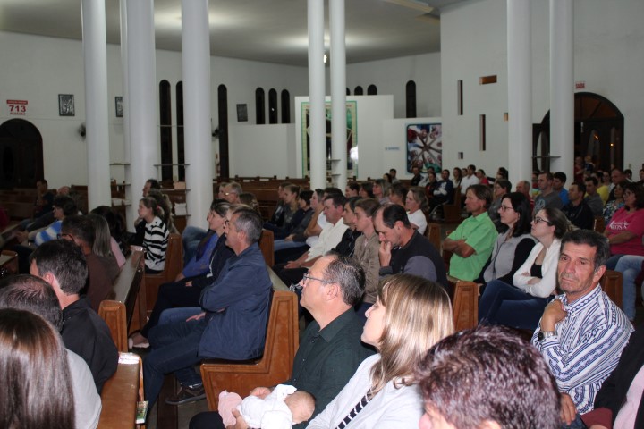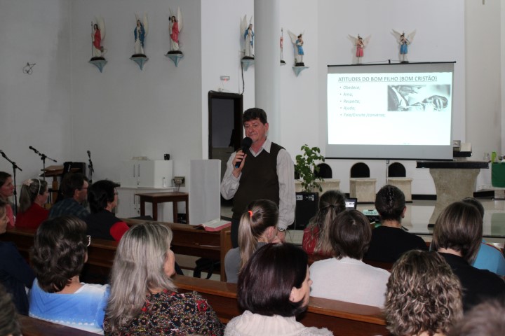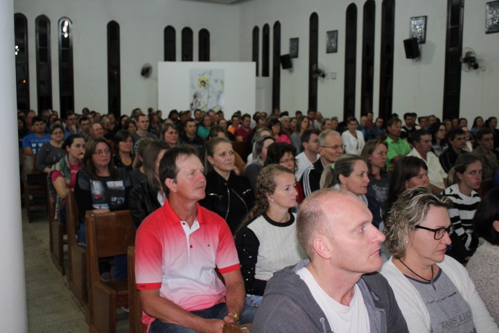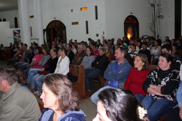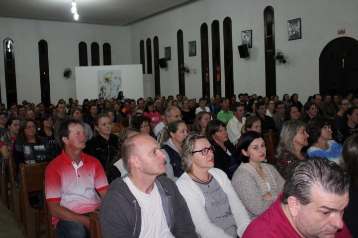 Aconteceu no dia 05 de outubro, na igreja matriz o encontro com os pais e os acompanhantes dos catequisandos do catecumenato crismal da matriz. A catequista Beatriz escreve: “Com muito carinho realizamos o encontro com a presença do frei Valdir Inácio Schneider de Vacaria – RS. Agradecemos muitos os mais de duzentos participantes neste encontro, o frei foi muito feliz, em dizer a nós e nos questionar e abrir os olhos para: Quem é Deus? Onde encontro Deus? Onde se manifesta? Quem é Deus para mim? Com certeza, para a maioria ficou claro, como Deus se faz presente em nossa vida. Onde, como, quando… Temos a convicção, que cada participante saiu motivado, com a certeza que Deus está sempre conosco”.