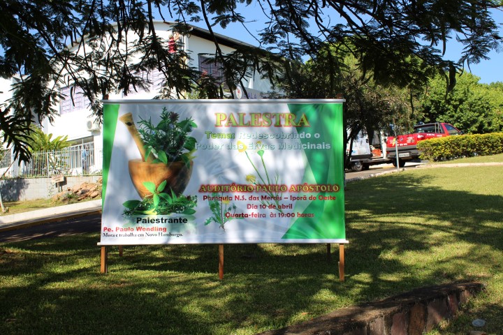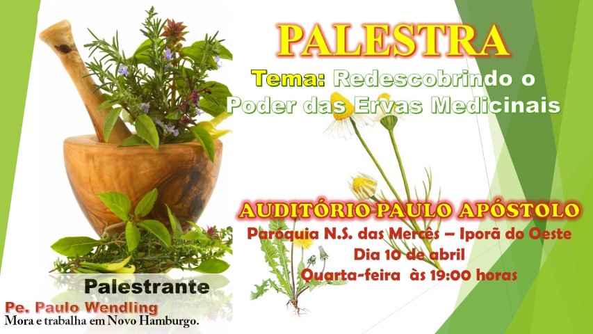 A paróquia de Iporã do Oeste está promovendo dia 10 de abril uma palestra sobre as ervas medicinais com o tema: “Redescobrindo o poder das ervas medicinais”. O assessor é o Pe. Paulo Wendling. A palestra será no auditório paroquial às 19:00 horas. Convidamos todos aqueles interessados em aprimorar seus conhecimentos sobre ervas e chás. Não terá custo algum e está aberta para todos.