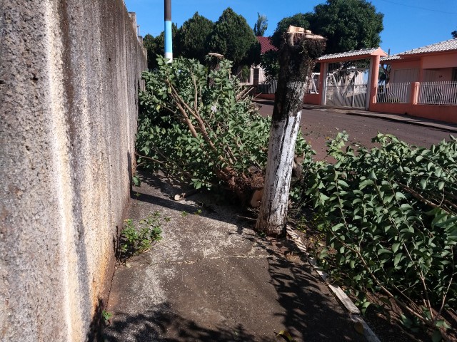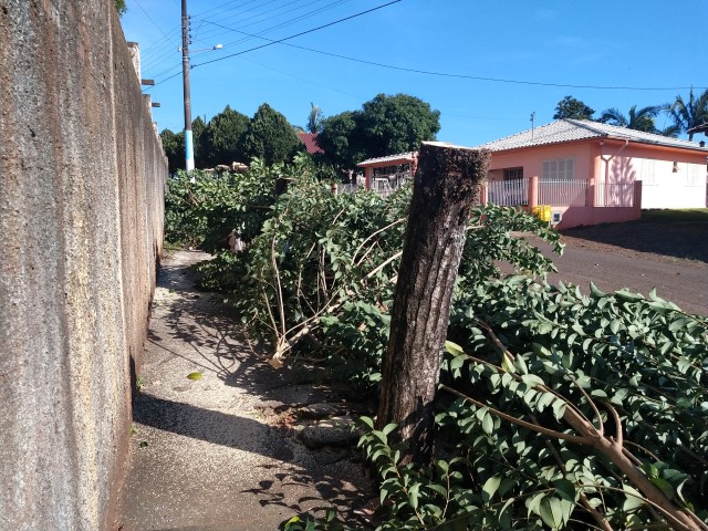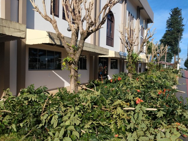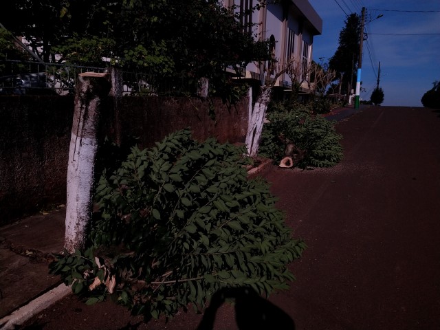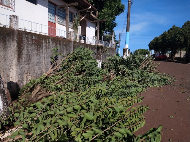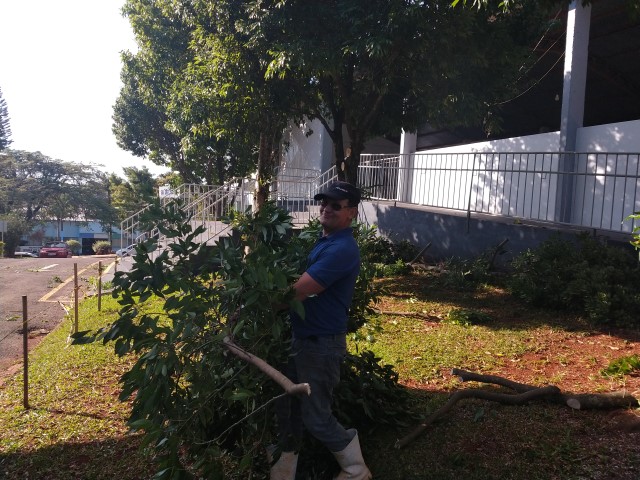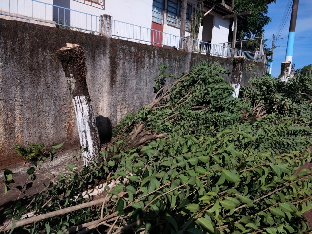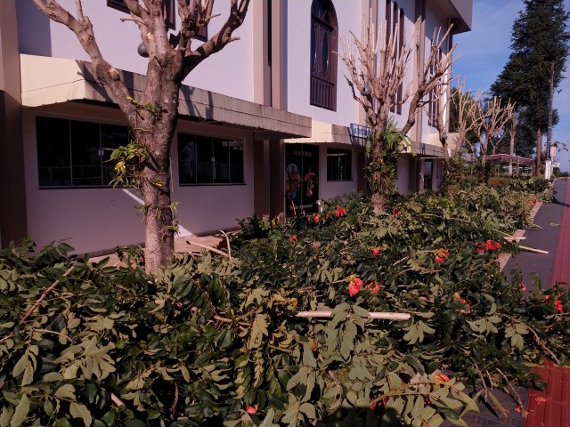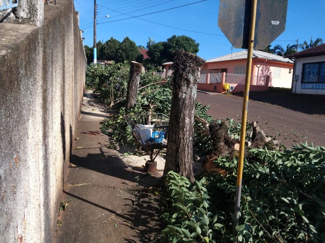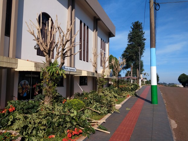 Iniciou hoje, dia 11 de junho a retirada e o corte das árvores ao lado da casa paroquia. Primeiramente pelo fato das mesmas ocupar um bom espaço da calçada e ao mesmo tempo está danificando esse piso; também as mesmas estão muito velhas e ajudará no clareamento da casa paroquial – haja visto que as mesmas com a sombra estavam mofando as paredes da construção; outro fato é que possibilitará o tráfego das pessoas pela calçada, pois como estava era complicado as crianças, os idosos, as pessoas passarem por ali – a calçada rachada e levantada causava risco as pessoas. Desta maneira resolveu tirar as árvores e melhorar esse espaço; e também aproveitou podar as árvores em frente à secretaria paroquial e as próximas ao pavilhão católico.