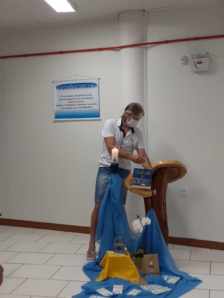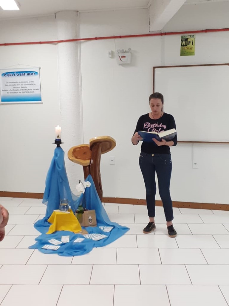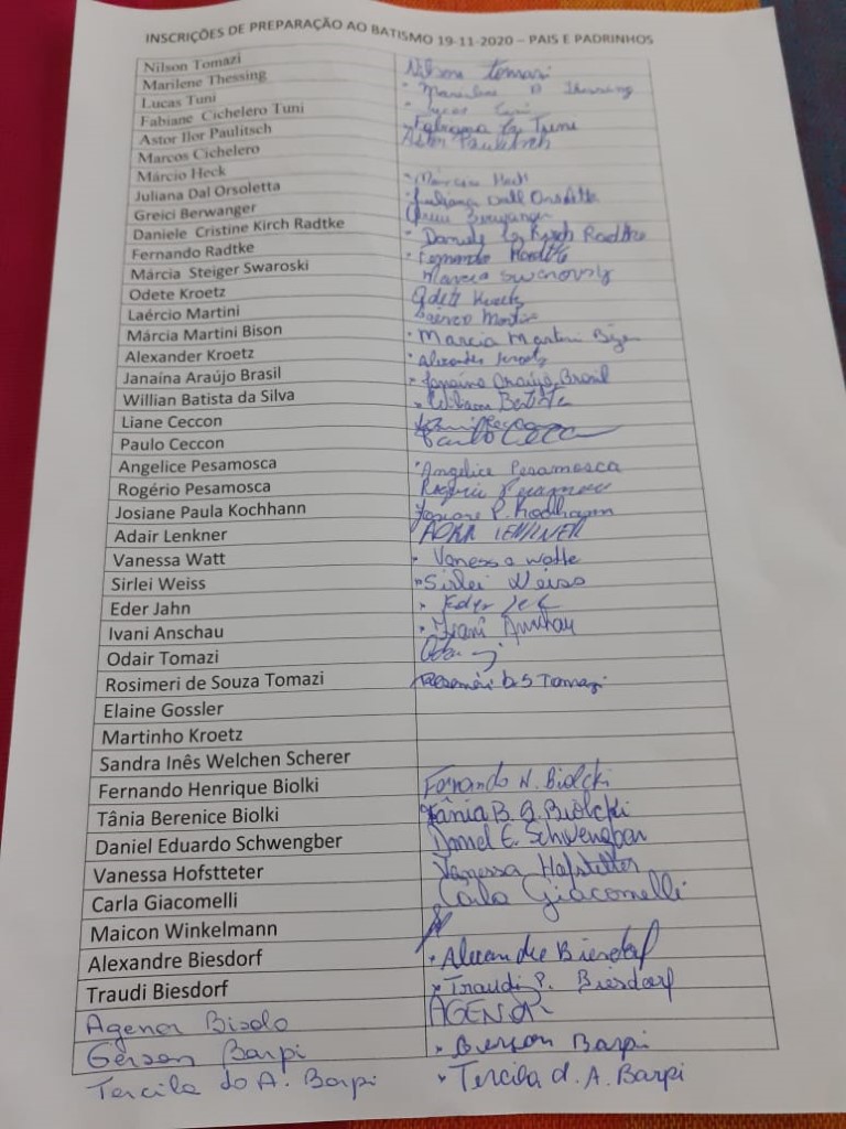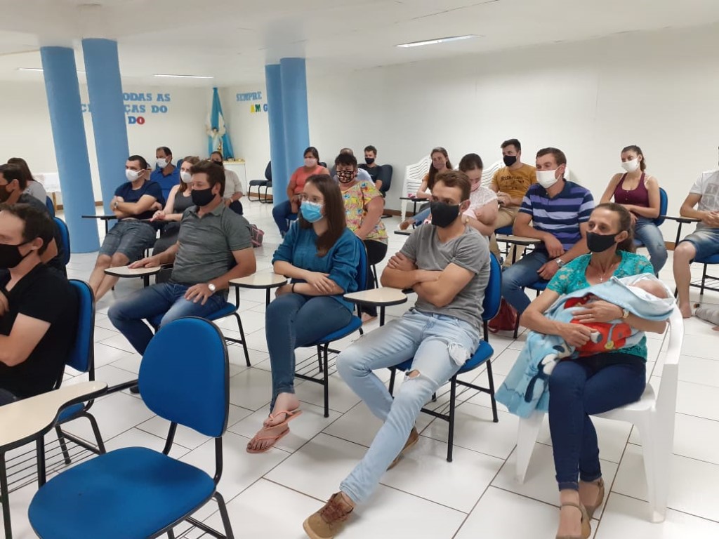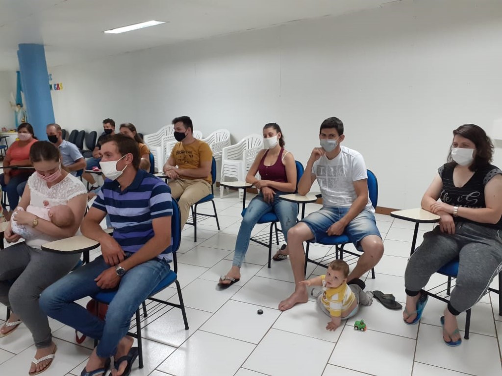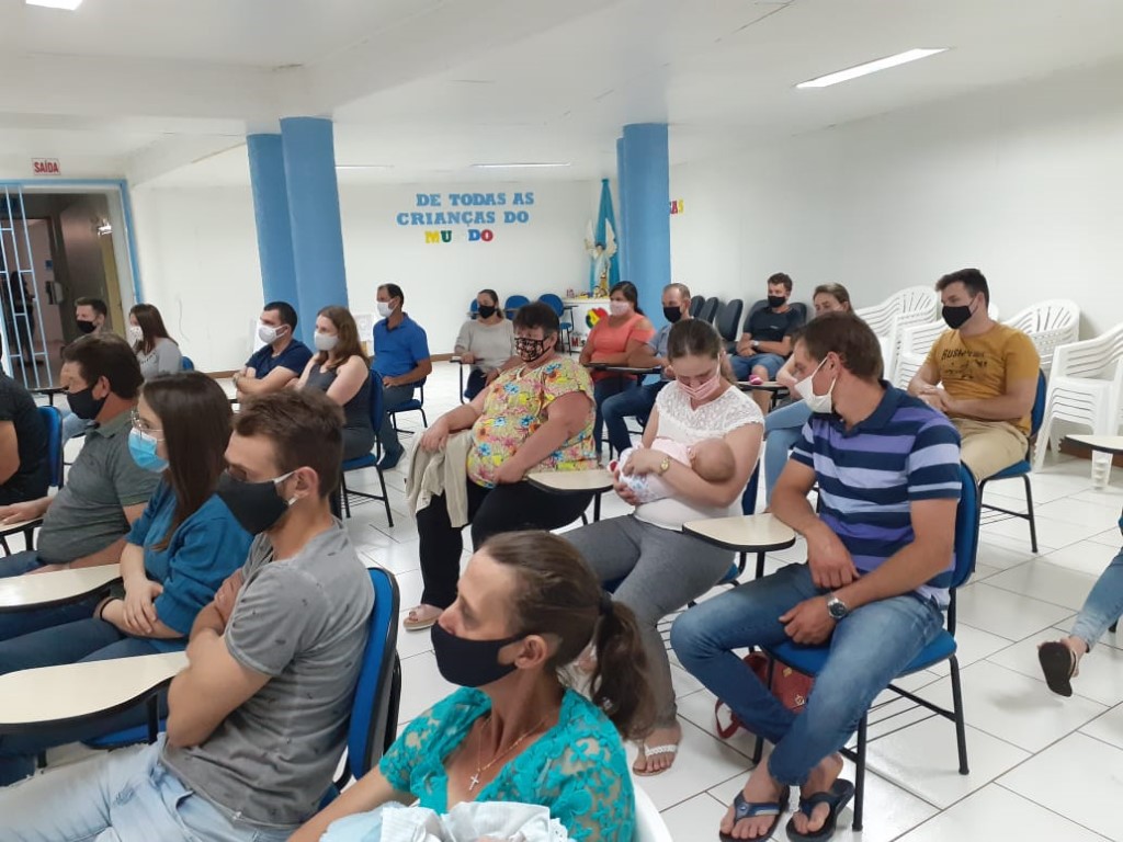 Continuando com as preparações para o Sacramento do Batismo, aconteceu no dia 19 de novembro a segunda etapa para pais e padrinhos com 48 participantes. A Beatriz conduziu a Preparação sobre o Batismo. Teve interação de alguns presentes que mostra que os participantes compreenderam o assunto. Estavam auxiliando a Fátima Colling e a Angela Tuni que são da Equipe da Pastoral do Batismo.