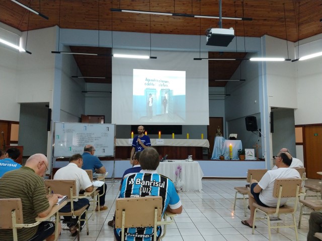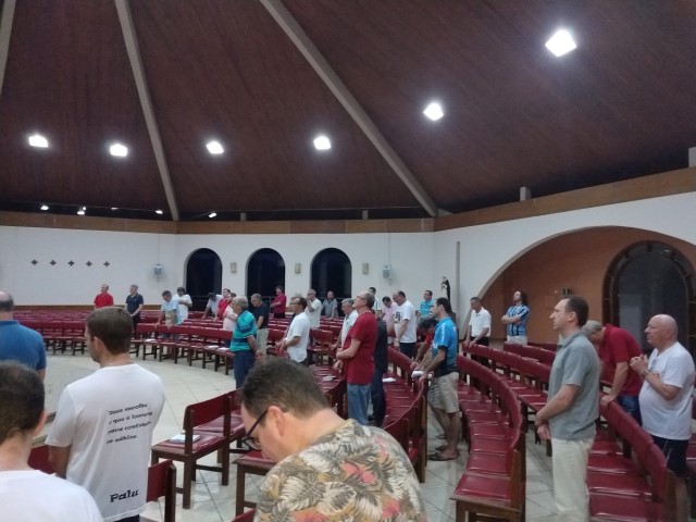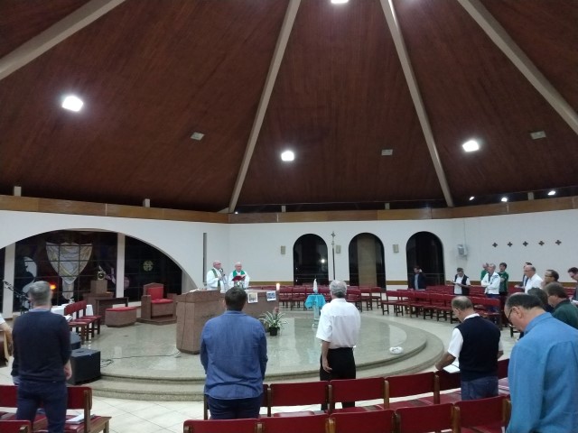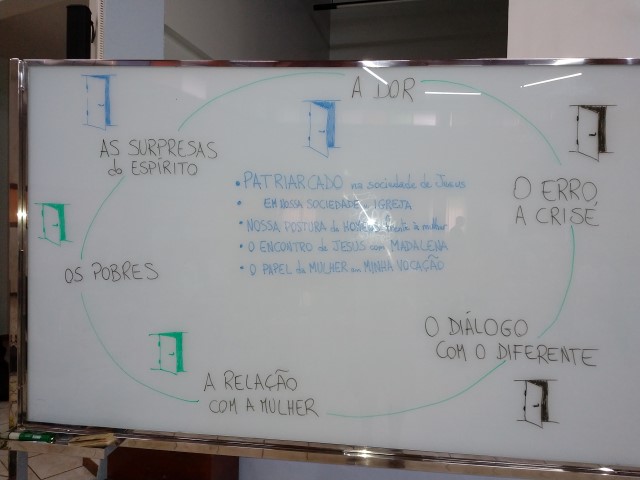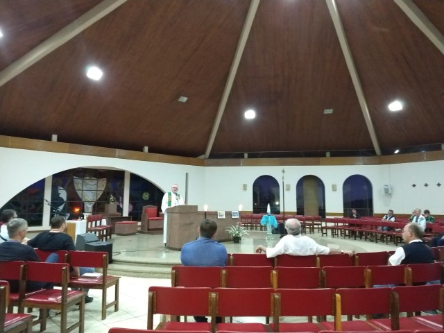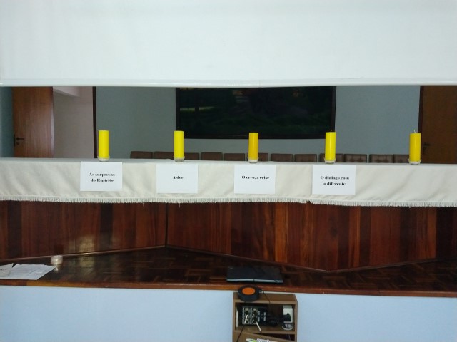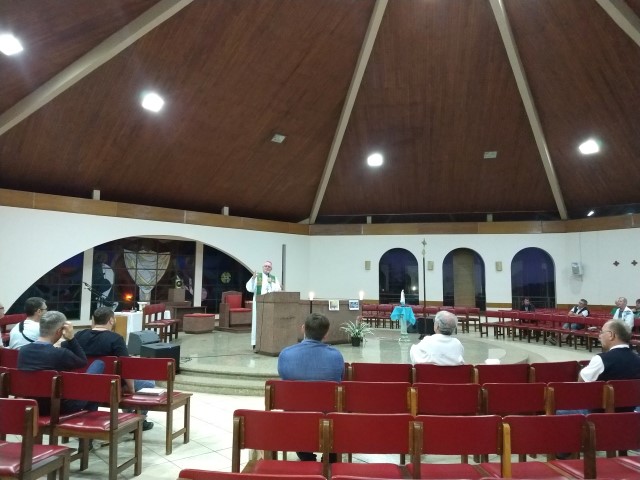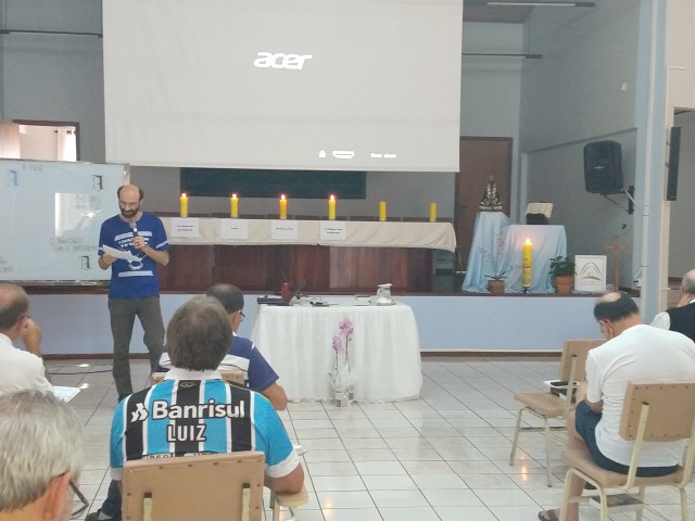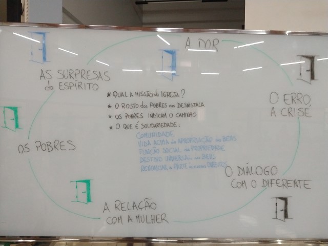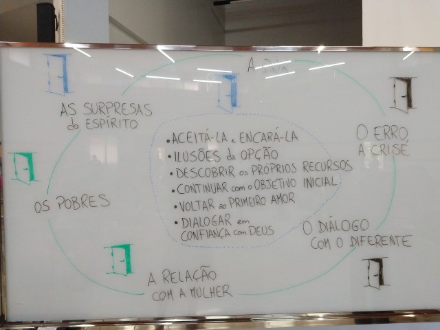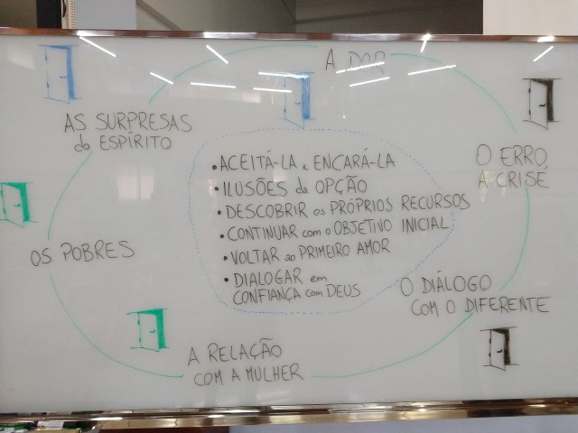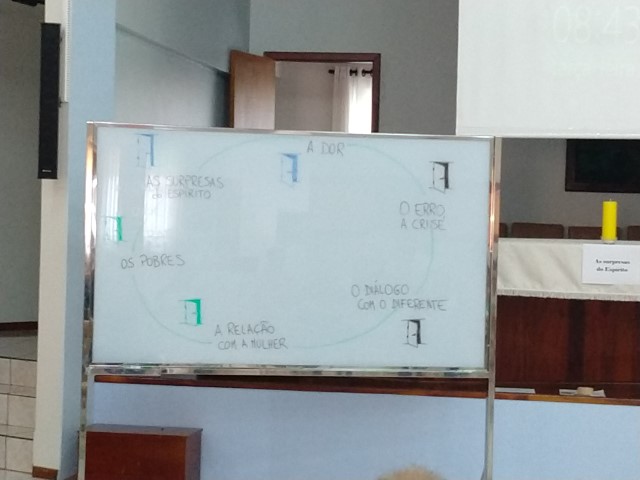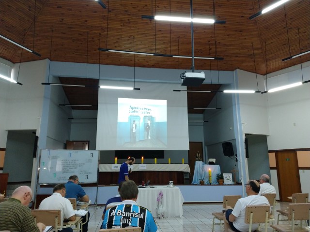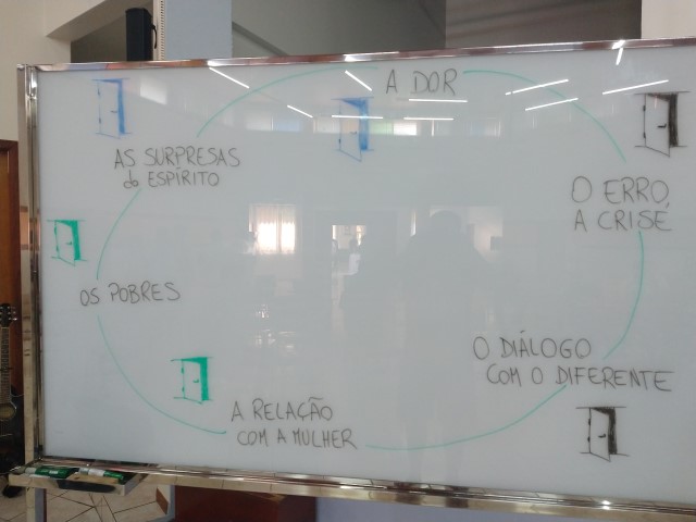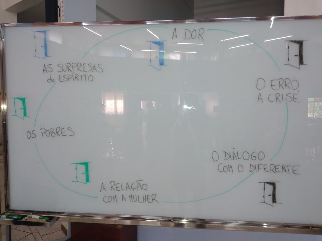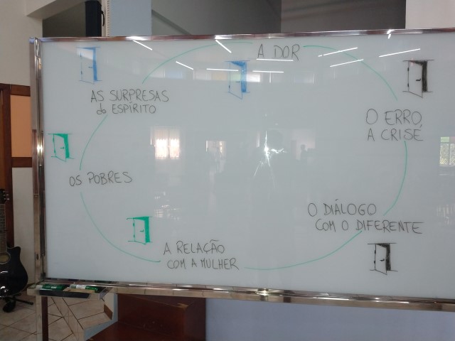 Aconteceu do dia 16 a 20 de setembro o retiro dos padres diocesanos de Chapecó na Casa de Formação – Divino Mestre da diocese de Francisco Beltrão/Palmas. O assessor foi o padre Dário Bossi – Missionário Comboniano do coração de Jesus – MCCJ. O assessor trabalhou o retiro a partir de seis portas que foram: As surpresas do Espírito, A dor, O erro, A crise, O diálogo com o diferente, A relação com a mulher e Os pobres. Em cada etapa foi acesso uma vela e o assessor fez o desenho da porta e um círculo entre eles. Segundo o assessor: “estes temas representam as fronteiras de nossa vida. As fronteiras são os lugares do imprevisto, da descoberta, do inédito, do encontro com o diferente… E, portanto, do encontro com deus. Assim, o círculo que percorre cada um dos temas é a oração: busca do rosto de deus nos momentos mais fortes, importantes ou delicados de nossa vida. Para uma igreja em saída, pessoas em saída. Sem medo de olhar para seus limites, que são as fronteiras de nosso espírito. Queremos nos escutar, escutar a vida nas fronteiras. Como peregrinos”.